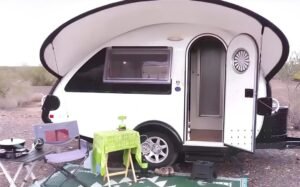 Sa caravane est équipée d’un grand auvent et de nombreuses fenêtres pour laisser entrer la lumière du soleil et l’air frais.