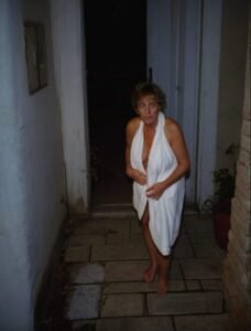 Je l’ai conduite au salon et l’ai installée sur le canapé. Elle tenait encore fermement sa serviette autour d’elle.