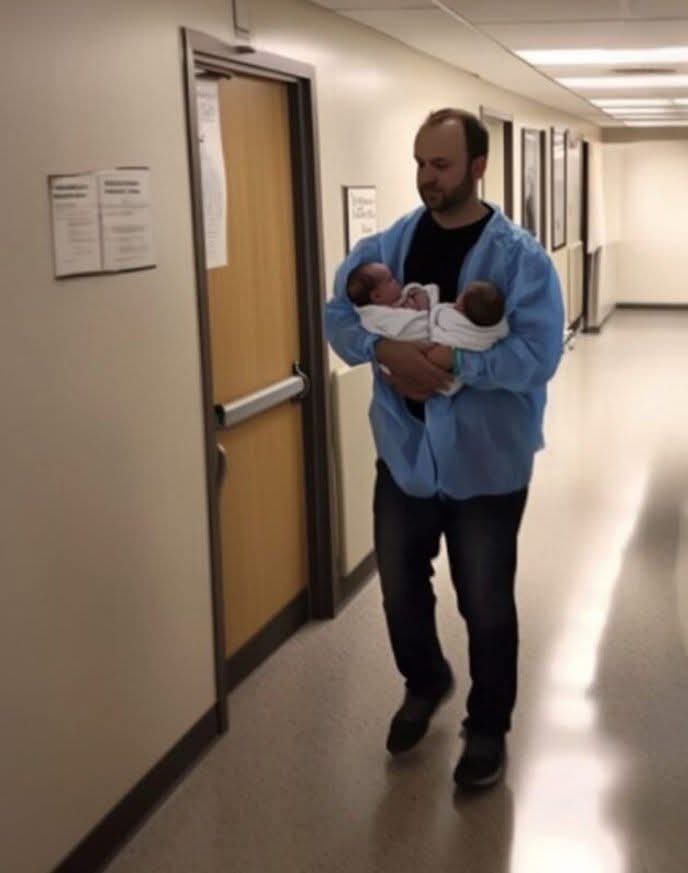 Dans ses bras, il tenait deux nouveau-nés enveloppés dans des couvertures pastel.