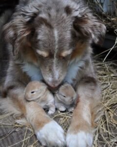 Deux petites boules blotties entre ses pattes. Au début, j’ai cru que c’étaient des chiots — peut-être qu’on les avait abandonnés et qu’elle les avait trouvés. Mais non. C’étaient des bébés lapins. Minuscules. Fragiles. Les yeux encore fermés. À peine vivants.
