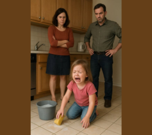 En franchissant la porte, un silence étrange l’accueillit. Pas un rire, pas un bruit. Intrigué et inquiet, il avança vers la cuisine… et découvrit une scène bouleversante : sa fille, tremblante et égratignée, frottait le sol tandis que la gouvernante la surveillait froidement.