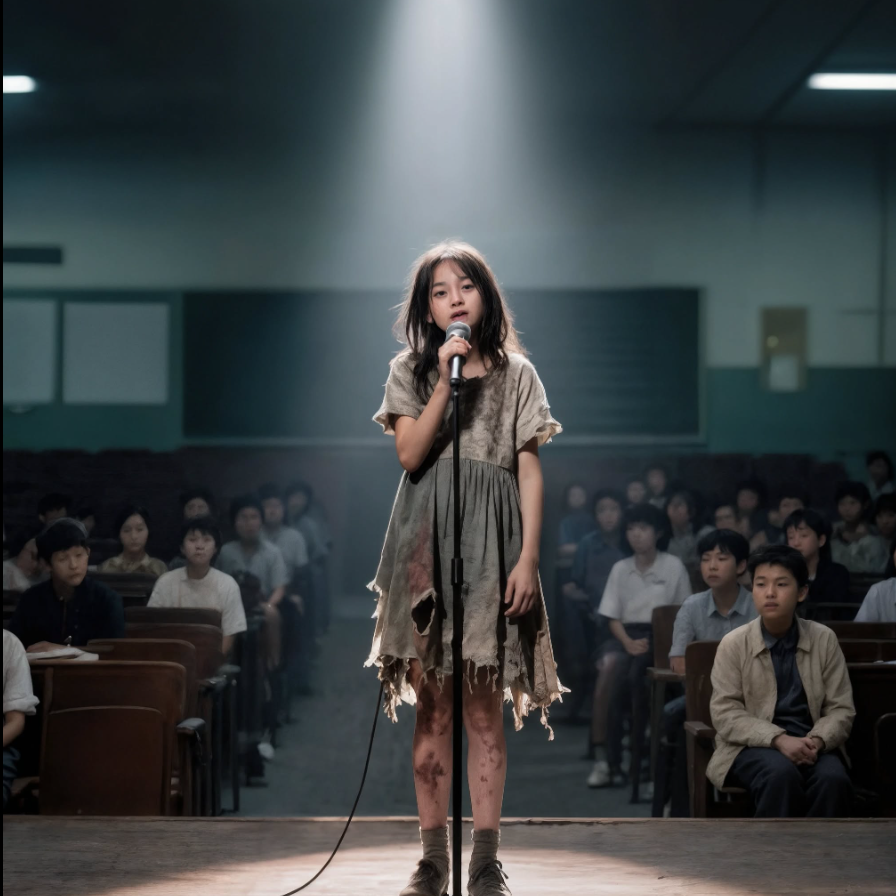 Quand elle monta sur scène, seule, face à des rangées d’élèves moqueurs, il n’y eut plus de bruit.